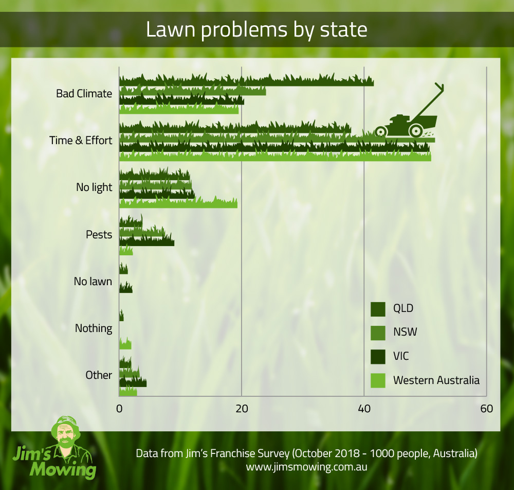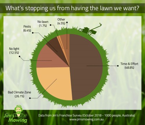We asked Australians what it is that’s keeping them from having the lawn they want. Not so surprisingly, nearly half of us (48.8%) just don’t have the time to maintain that lush grass or we just can’t be bothered. The next biggest issue was shady backyards — how can your grass grow if there’s no sun? Pets and pests were a worry too at 6.4 per cent and our fickle Australian weather bothered more than one in four gardeners.