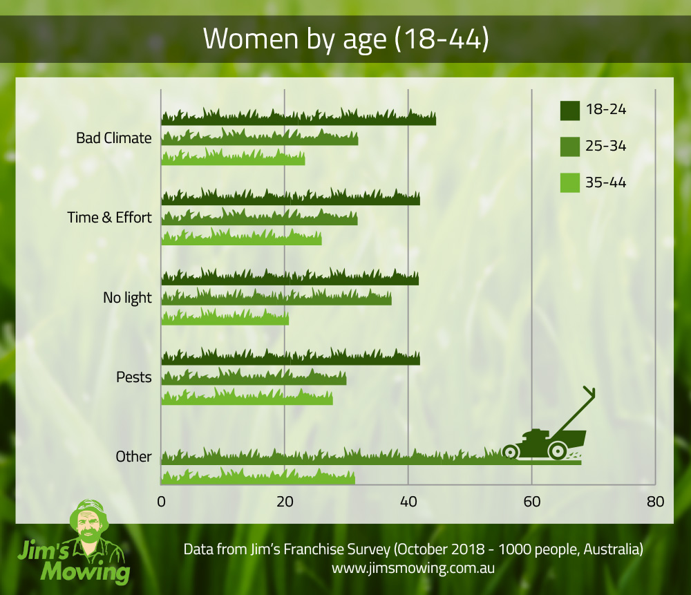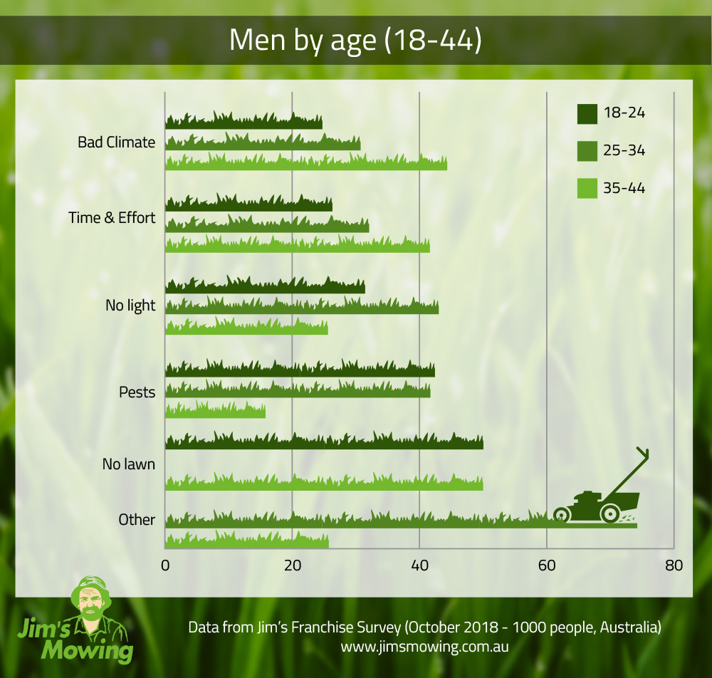 We compared men and women by their age groups (from 18-44) and found that men seem to start out keener to mow the lawn and get lazier or busier with age. Women had the opposite result, finding more time or effort for the lawn mower as they got older. No matter your age or gender, the dream of a perfect lawn is so often outweighed by wanting to do literally anything other than lawn mowing. Our advice? First up, get a low maintenance and low mow turf (they exist!) like Zoysia Matrella.